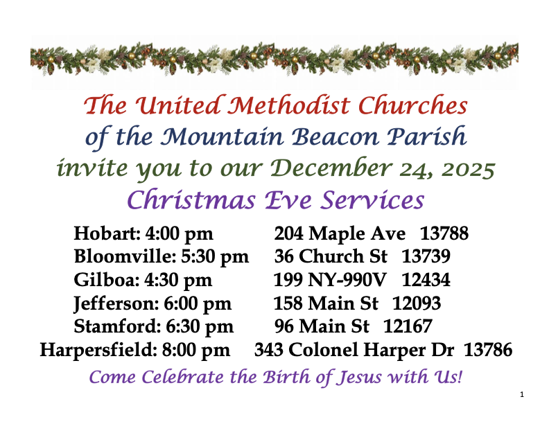The Delaware Headwaters Charge has brought together Bloomville UMC, Conesville Chapel, Gilboa UMC, Harpersfield UMC, Hobart UMC, First Presbyterian Church/Stamford UMC, and Township UMC under the direction of Pastor Dawn Richard and Pastor Peggy Laemmel. We are happy to have you as a member or a visitor to our churches. God has been doing wonderful things in our communities . . . we invite you to come, share in the fellowship, take root, and grow with us.
